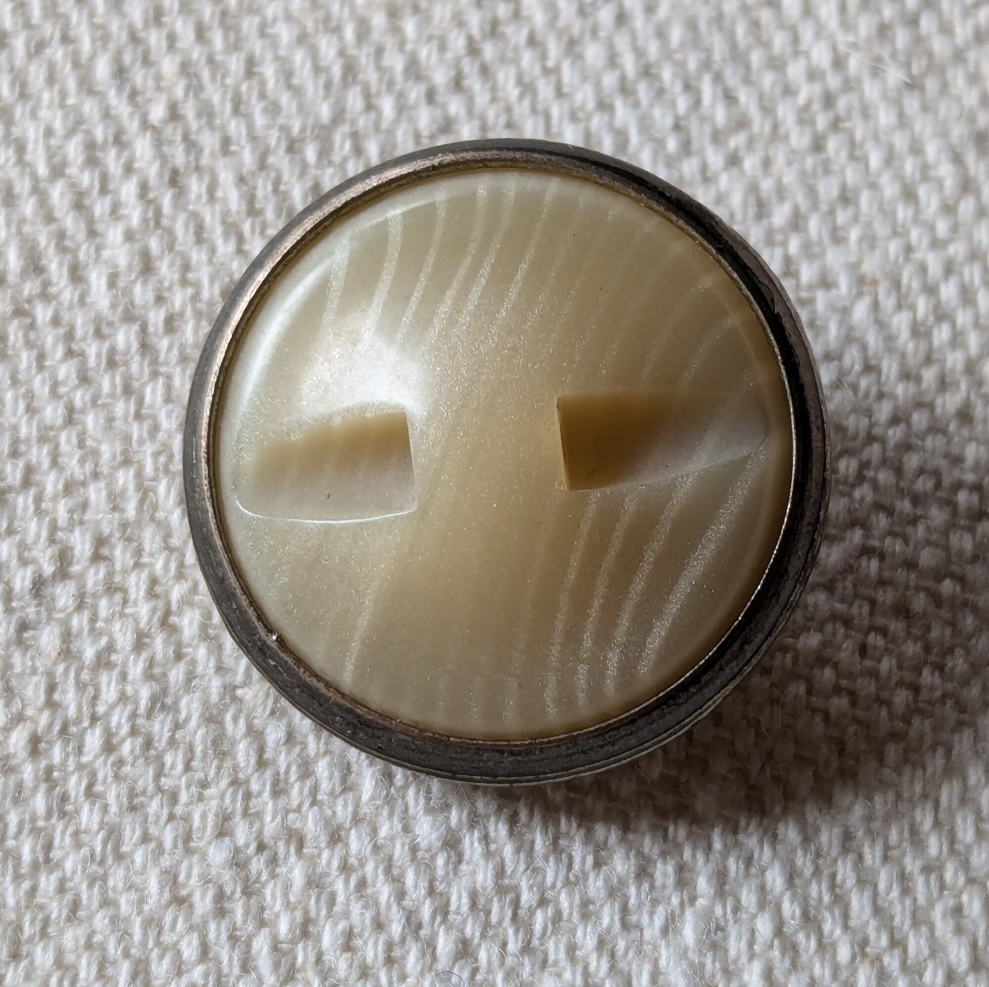アイボリー色の樹脂製部分は経年のためか飴色がかってきてボタンにより個体差がありますが、味として楽しめる変化だと思います。